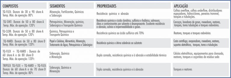 A TQA disponibiliza para todo o mercado uma linha de compostos de borrachas antiabrasiva e anticorrosiva com total eficiência para revestimentos e reparos permanentes em equipamentos em gerais.